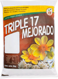Triple 17 Mejorado es una mezcla física de diferentes fertilizantes granulados, los cuales proporcionan los tres nutrientes esenciales en forma balanceada. Su aplicación se recomienda para todos los cultivos. En la siembra, transplante y posteriormente durante el crecimiento y desarrollo.