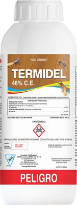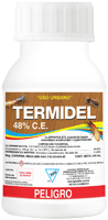 |   1 lt de TermiDel 48    en 50 lts de agua.       | Aplicar  a baja presión de 3 a 5 lts de producto    preparado por metro lineal formando una barrera química de 30 a 50 cm de ancho, alrededor    de cada instalación. |