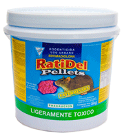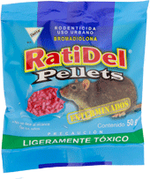 RatiDel Pellets: Es una formulación sólida, producto de una mezcla de diferentes granos molidos y comprimidos con un anticoagulante de segunda generación como la Bromadiolona. Es de alta aceptación por los roedores debido a sus ingredientes de primera calidad.