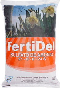 FertiDel SULFATO DE AMONIO es un fertilizante químico de uso ornamental y agrícola, para ser aplicado al suelo, contiene 21% de Nitrógeno en forma amoniacal y 24% en forma de sulfatos (azufre). Por lo que en peso este producto tiene el 45% de nutrientes totales de fácil aprovechamiento para las plantas.